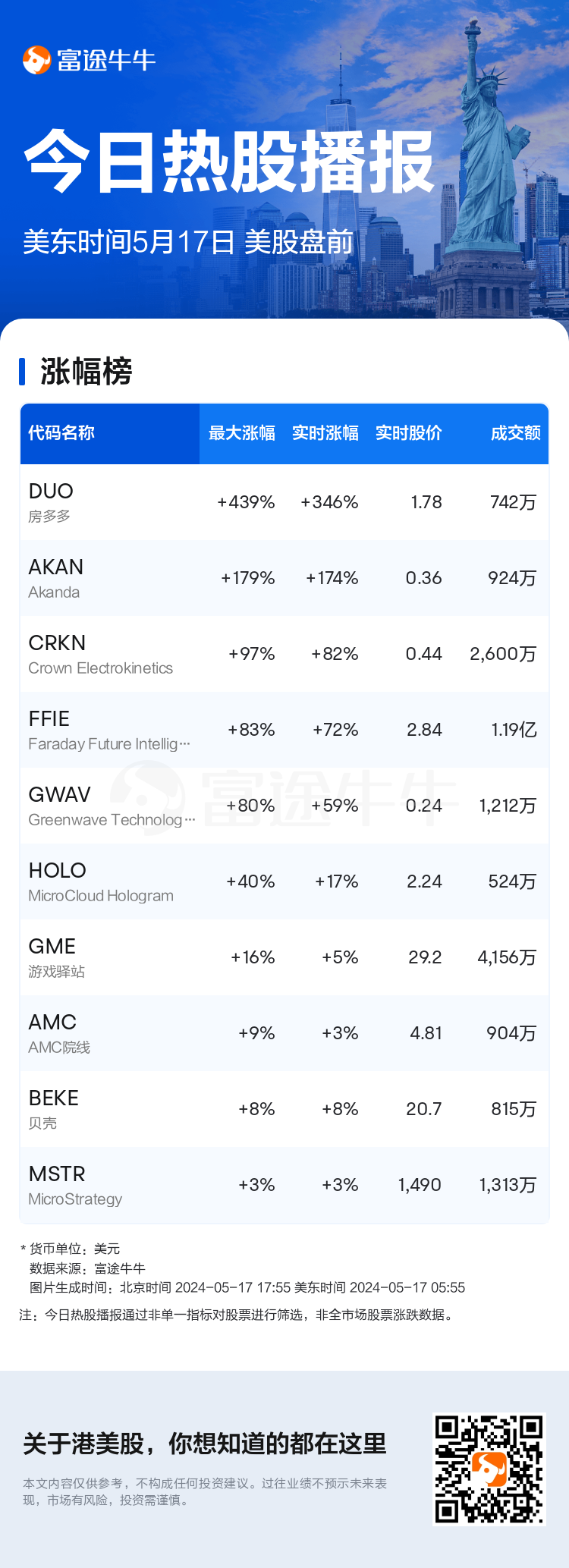 美东时间5月17日报道,以下为今日美股盘前热门个股。
